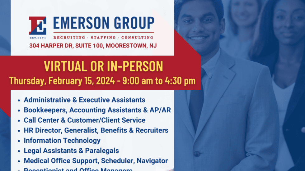 Emerson Group’s Job Seeker New Candidate Open House Feb 15, 2024 from 9 am to 4:30 pm