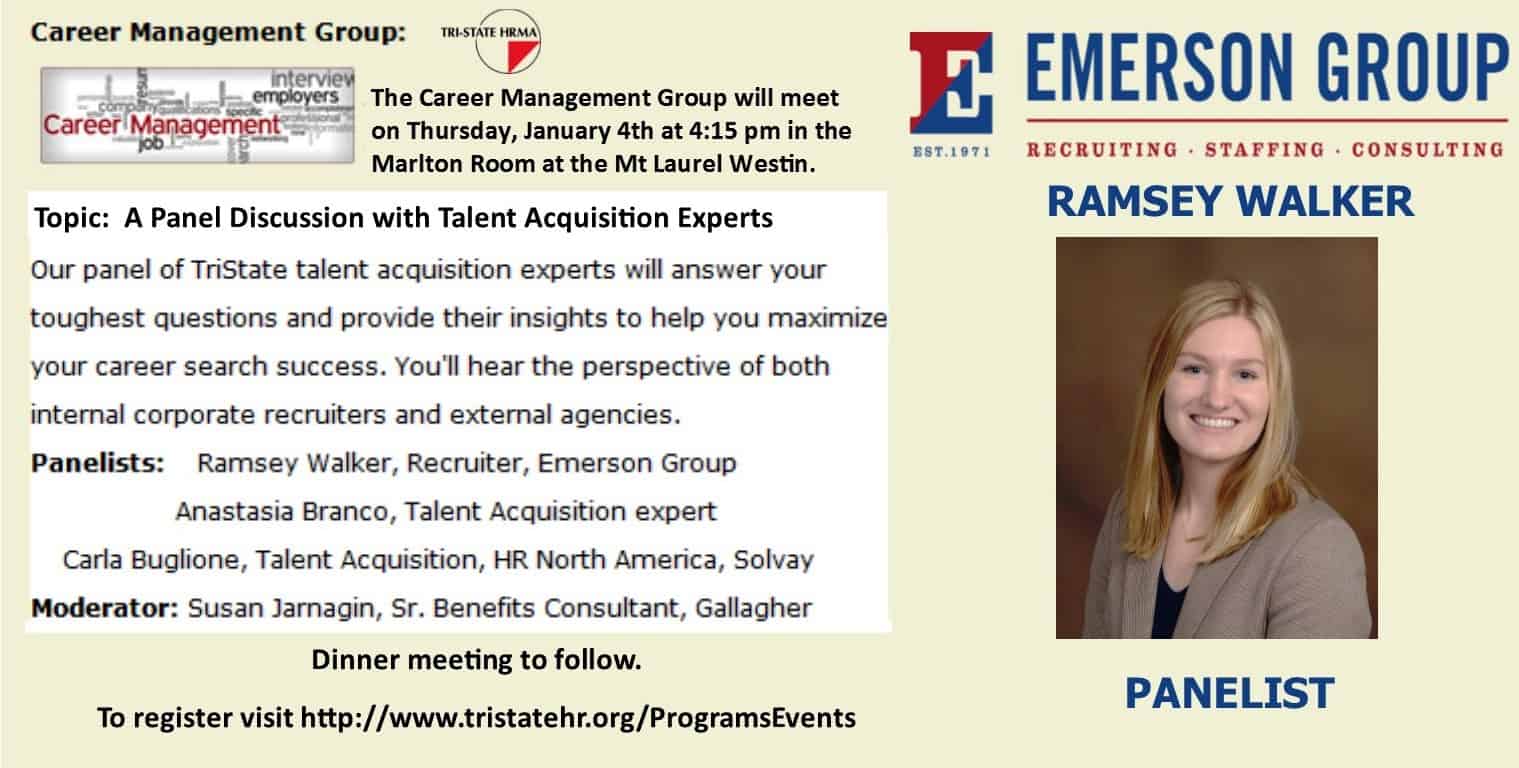Emerson’s recruiter, Ramsey Walker, will be a panelist on Thursday, January 4th Tristate HRMA Career Management Group‘s meeting at 4:15 pm followed by their dinner meeting at 5:15 pm.