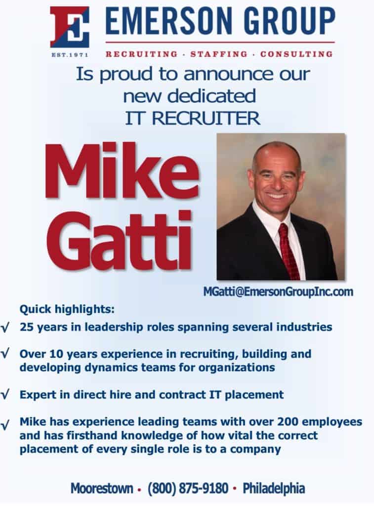 Emerson Group, a recruiting and staffing firm located in Moorestown NJ and Philadelphia PA, is excited to announce the hiring of their new IT Recruiter Mike Gatti. With 25 years in leadership roles, Mike has spent over 10 of them in recruiting. “Mike is a great addition to the already experienced Emerson Team” said Bill Emerson, President of Emerson Group. “Mike’s superior customer service for both clients and candidates is a perfect fit with our “Emerson Way” approach of Recruiting to Culture”.
