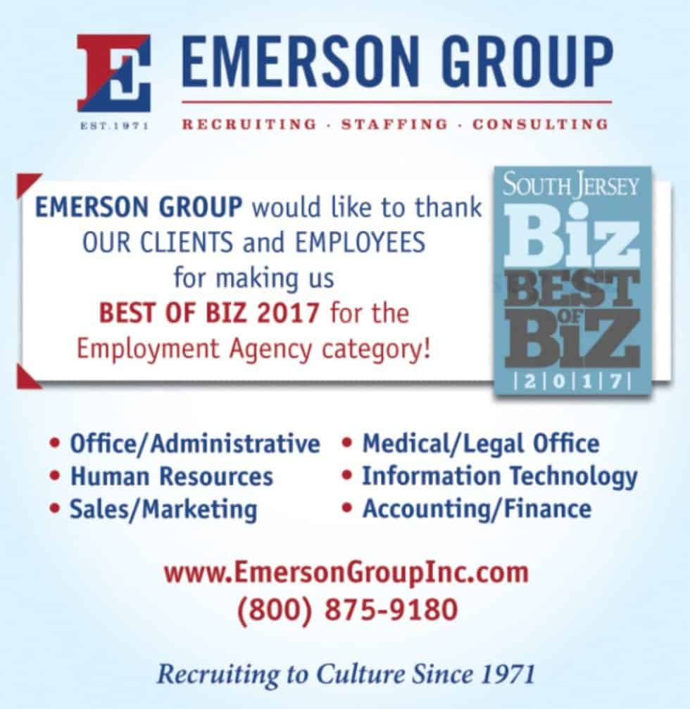 The annual list of South Jersey Biz magazine’s BEST OF BIZ came out and Emerson Group is the Editor’s pick for Best Staffing Agency/Employment Services for 2017!