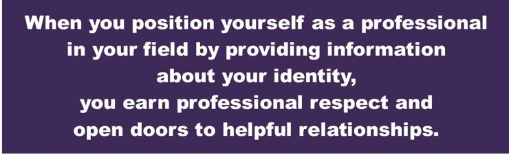 Let’s start with a definition. Self-promote does not mean “be obnoxious.” If you sound cocky about what you do or you only talk about your job hunt then you certainly could come across as annoying. The idea in networking is to be professionally “visible” and to be involved. The goal is to develop professional relationships and to do so in an honest and genuine way, focusing on your interest in others. Part of that process is taking time to learn who others are. Aren’t you curious about the people you meet? What position do they have in the organization itself? What do they do professionally? That gives you information about their identity so you can further a relationship – perhaps you can help them in some way; maybe you know someone who can use their services; and of course, perhaps this person would be a great connection to a company or industry that you are exploring. So the reverse is true, too. People want to know who you are and what your professional identity is for the same reasons that you do. When you position yourself as a professional in your field by providing information about your identity, you earn professional respect and open doors to helpful relationships.