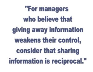 For managers who believe that giving away information weakens their control, consider that sharing information is reciprocal. Put information to work for you. Knowledge achieves maximum effectiveness when it is shared with people who use it every day. The more widely you ‘give away’ knowledge, the more effective and trusted you will be as a manager.