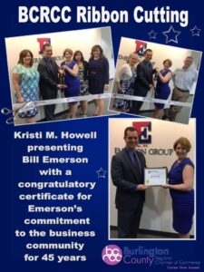 Wednesday, June 1, 2016 Emerson Group celebrated their 45th anniversary and new Moorestown office with an open house. A ribbon cutting ceremony was conducted by Kristi M. Howell with the Burlington County Regional Chamber of Commerce. She also presented Bill Emerson, President of Emerson Group, with a congratulatory certificate. “We are blessed to be celebrating 45 years in business and grateful to have such amazing support from clients, vendors, friends and family.” said Bill Emerson. He continued “And having my parents Skip and Annette here was really special, as they opened the doors 45 years ago back in 1971. Since then we have operated on a foundation of Core Values that have defined who we are and what we stand for. These values are paramount to every decision and action we make. We have gone through changes in family ownership, name, employees, recessions, and booms. Our Core Purpose to help others become more successful and Core Values of Honesty and integrity – Fairness, respect, and genuine care for others – Personal attention, have not changed.”