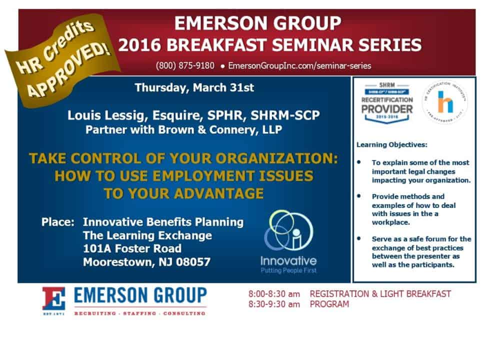 Emerson Group is proud to offer our first breakfast HR credited Seminar Series for the new year! LIMITED SEATS AVAILABLE. For more information, a quick video from the speaker, or to register (click here)