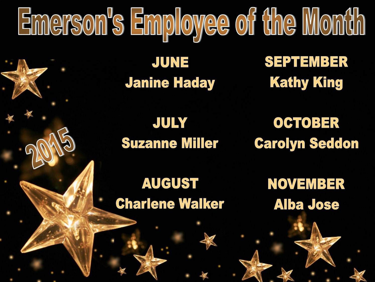 We’d like to recognize our last six Employees of the Month who are stars in our eyes! Thank you for your hard work and representing Emerson Group so well!