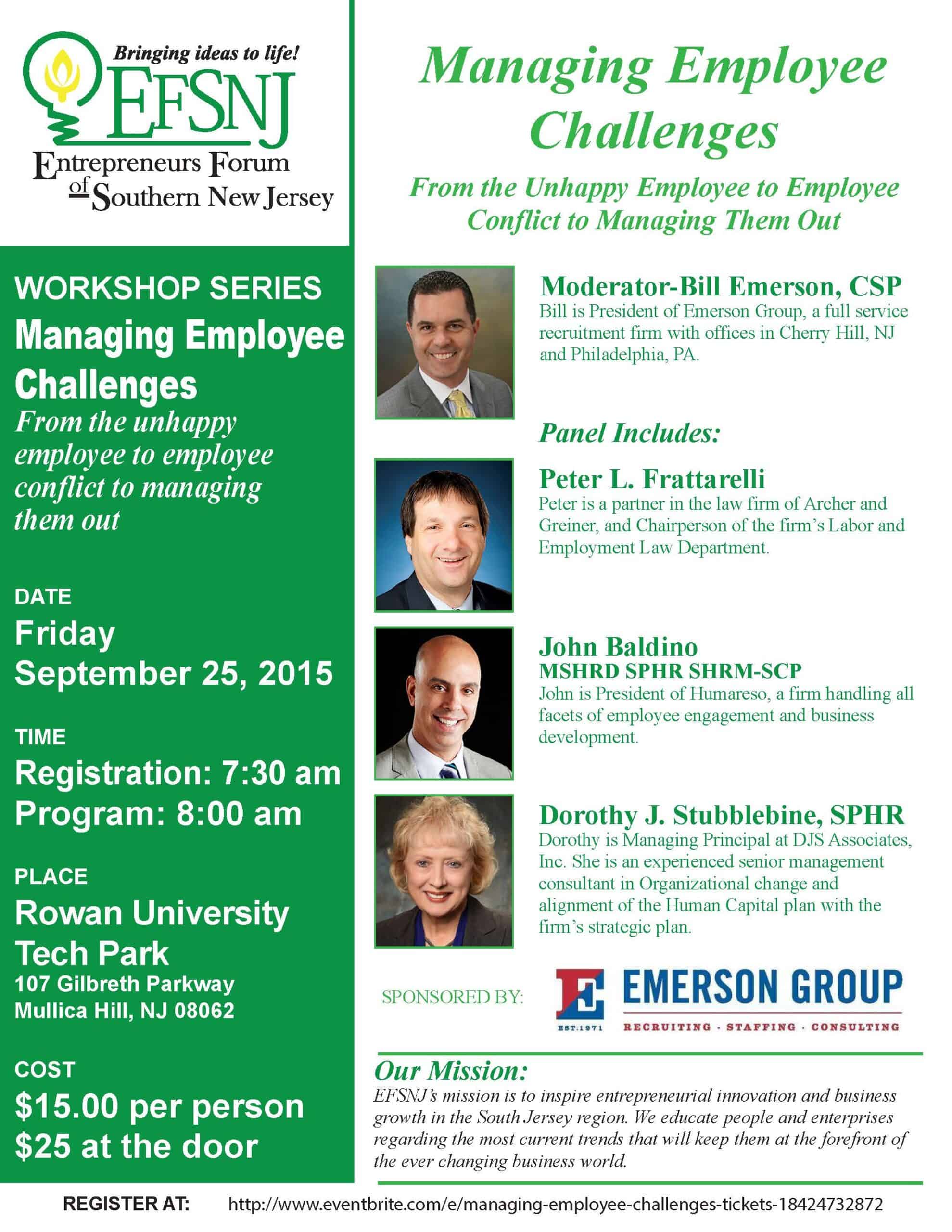 Emerson Group’s own, Bill Emerson will be the moderator for EFSNJ Entrepreneurs Forum of Southern New Jersey’s MANAGING EMPLOYEE CHALLENGES on Friday, September 25, 2015 starting at 7:30am. Click here to register and see below is more information about program.