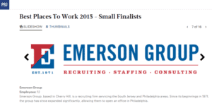 Emerson Group was named one of the fifteen finalists in Philadelphia Business Journal’s 2015 Best Place to Work in the small company category (defined as having between 10-49 employees).