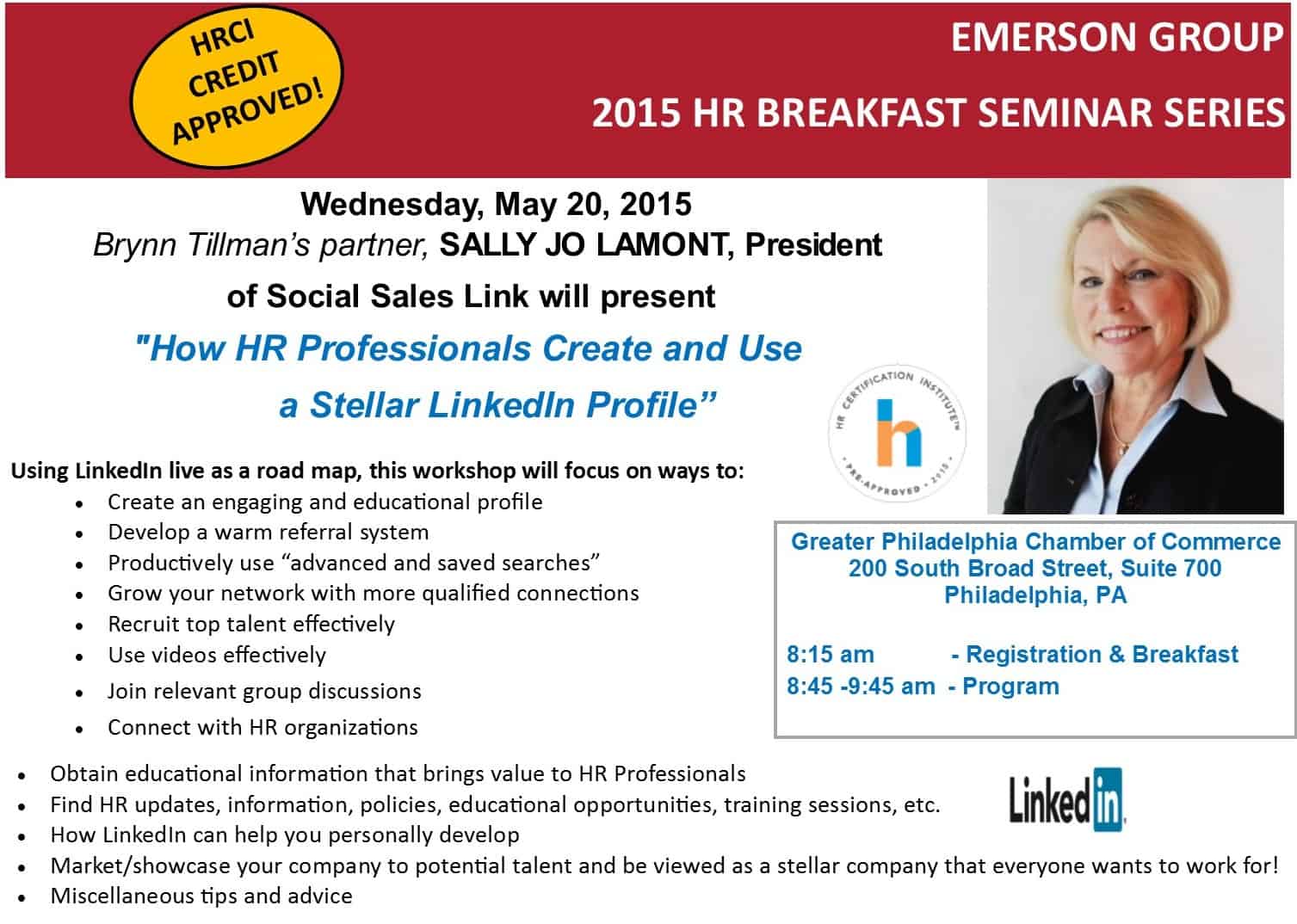 Please join us for an INTERACTIVE hour with Sally Jo LaMont, President of Social Sales Link. She is a professional trainer and coach who will use the LinkedIn site LIVE as a road map to help your HR needs. (Click here) to register for this and our last two seminars in September and October with Lou Lessig and EllenMarie Cope.