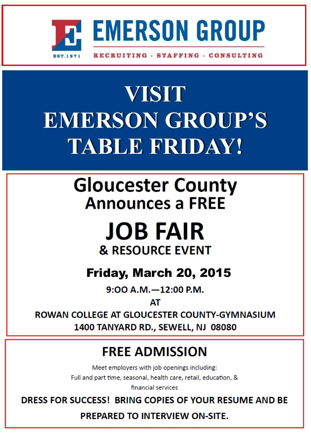 Be Sure To Stop By Emerson Group’s Table At The March 20, 2015 Gloucester County Job Fair