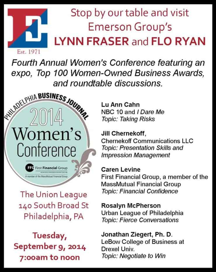 Stop by our table and visit Emerson Group’s LYNN FRASER and FLO RYAN at the Philadelphia Business Journal’s 4th Annual Women’s Conference featuring an expo, Top 100 Women-Owned Business Awards, and roundtable discussions on Tuesday, September 9th from 7:00am to noon at The Union League.