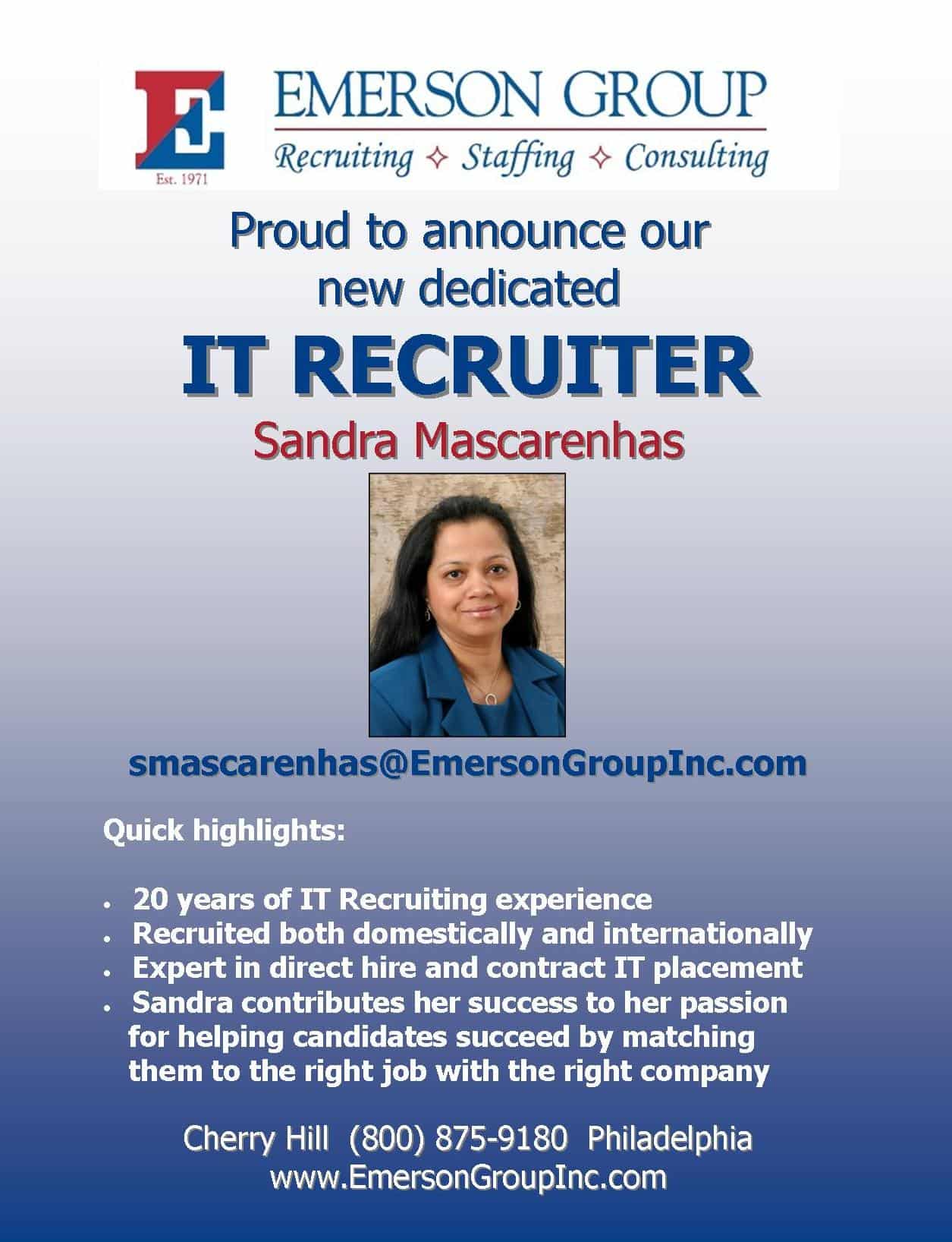 Emerson Group is proud to introduce their new dedicated IT RECRUITER Sandra Mascarenhas. Sandra brings with her over 20 years of IT Recruiting experience.