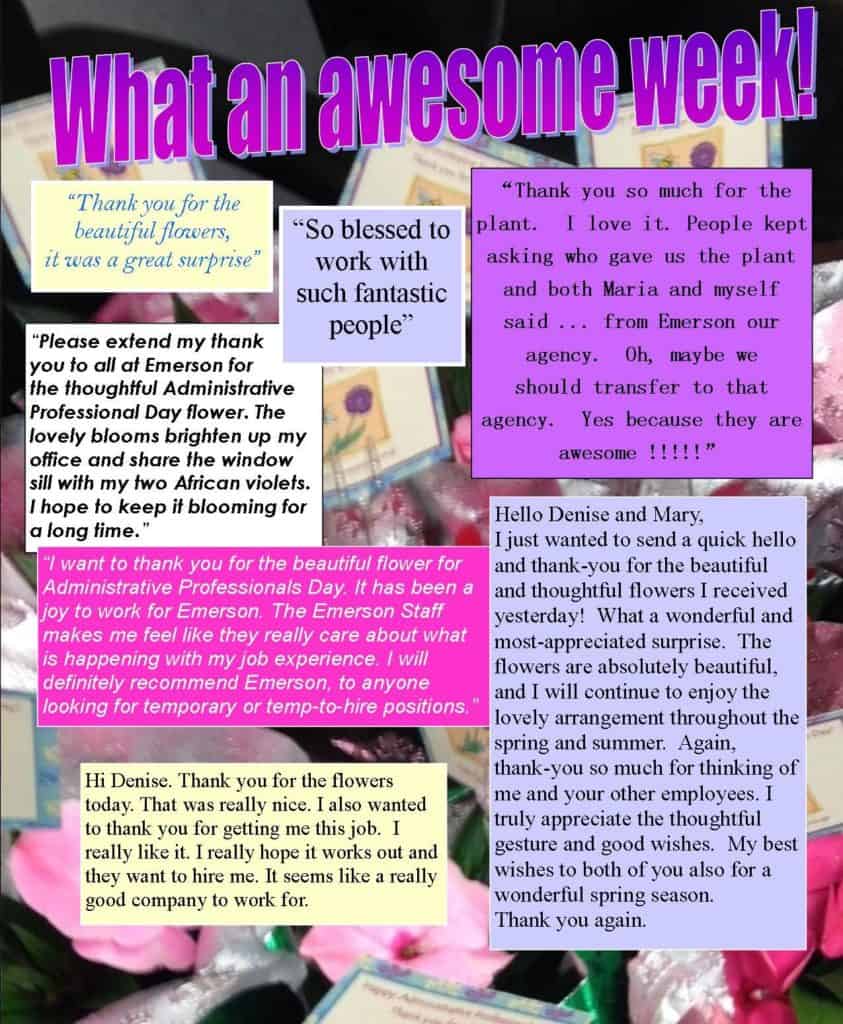 Emerson Group had a great week celebrating and honoring our staff during Administrative Professionals week 2014. We visited and hand delivered gifts to all our employees. We wanted to personally thank them for all they do and representing Emerson Group so well each and every day! They are the best!