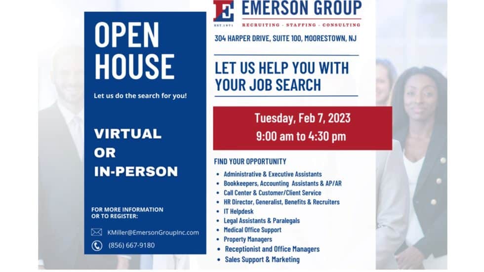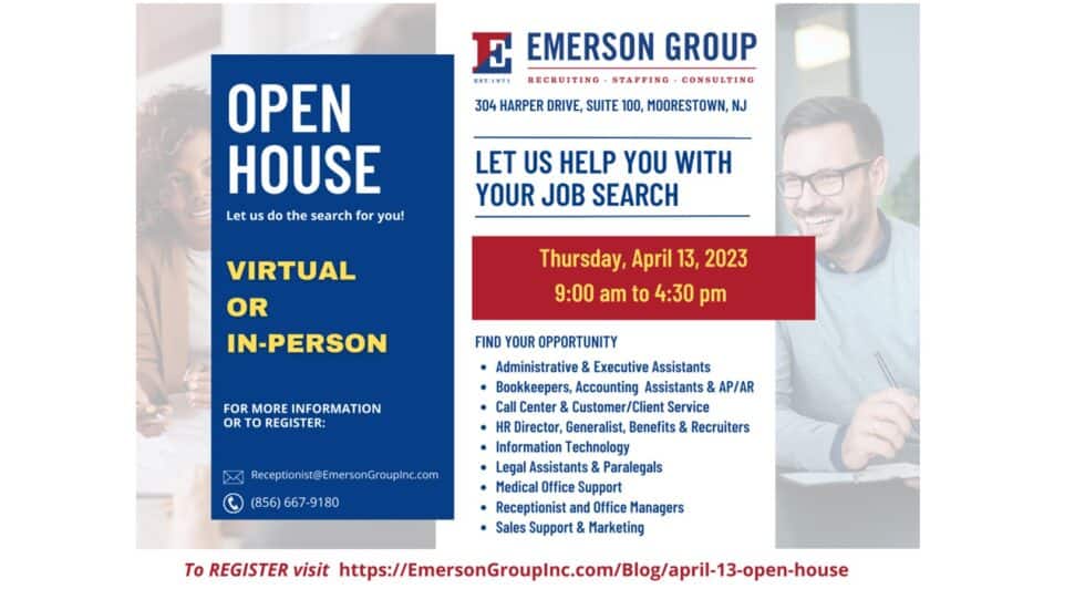 Emerson Group’s April 13th JOB SEEKER OPEN HOUSE – Find your next job, talk with a recruiter, let us do the search for you!