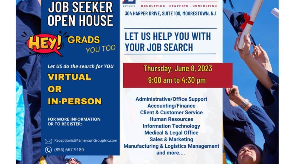 Emerson Group’s JOB SEEKER OPEN HOUSE – Welcome Grads! Find your next job, talk with a recruiter, let us do the search for you!