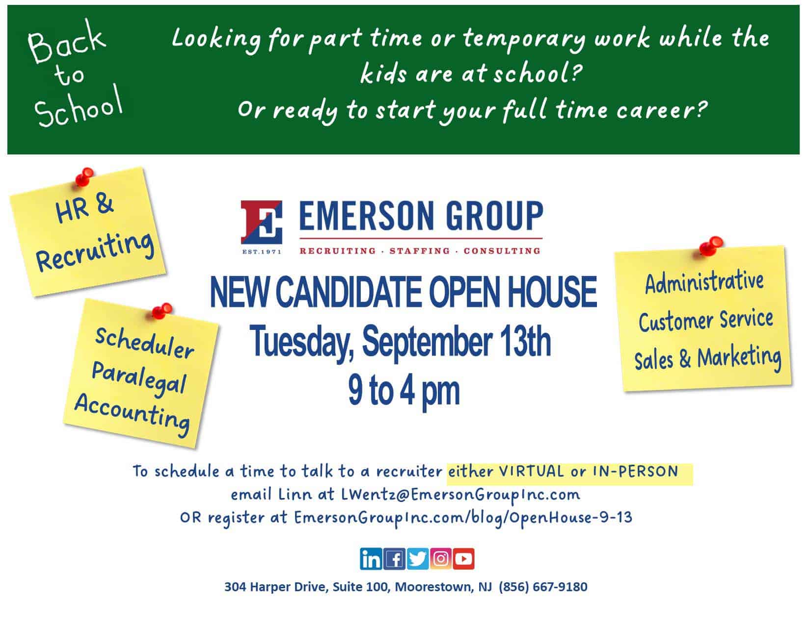 Emerson Group NEW CANDIDATE Open House – September 13th from 9am-4pm
