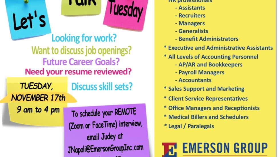 Emerson Group Let’s Talk Tuesday – Open House for New Candidates – Nov 17, 2020