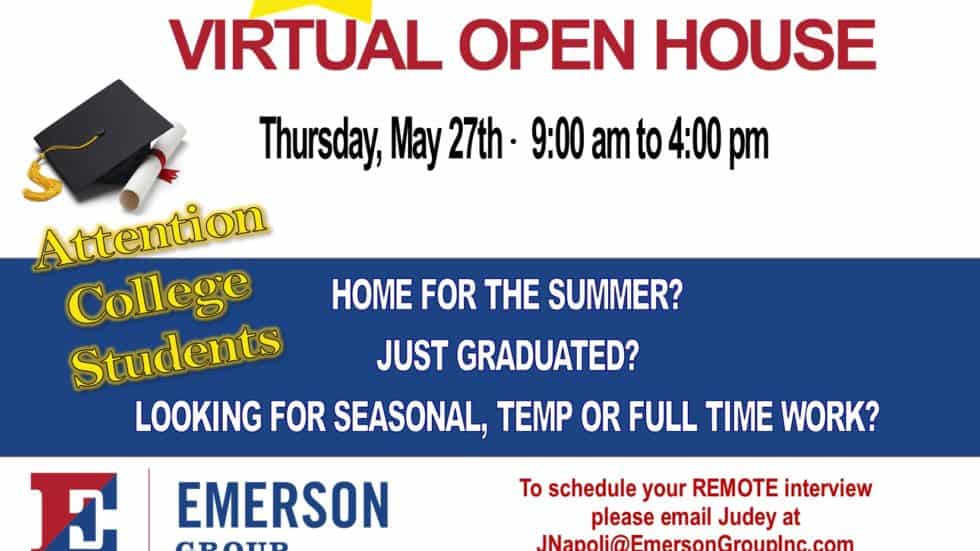 Emerson Group’s NEW Candidate and COLLEGE STUDENT Open House – Thursday, May 27 from 9am – 4pm