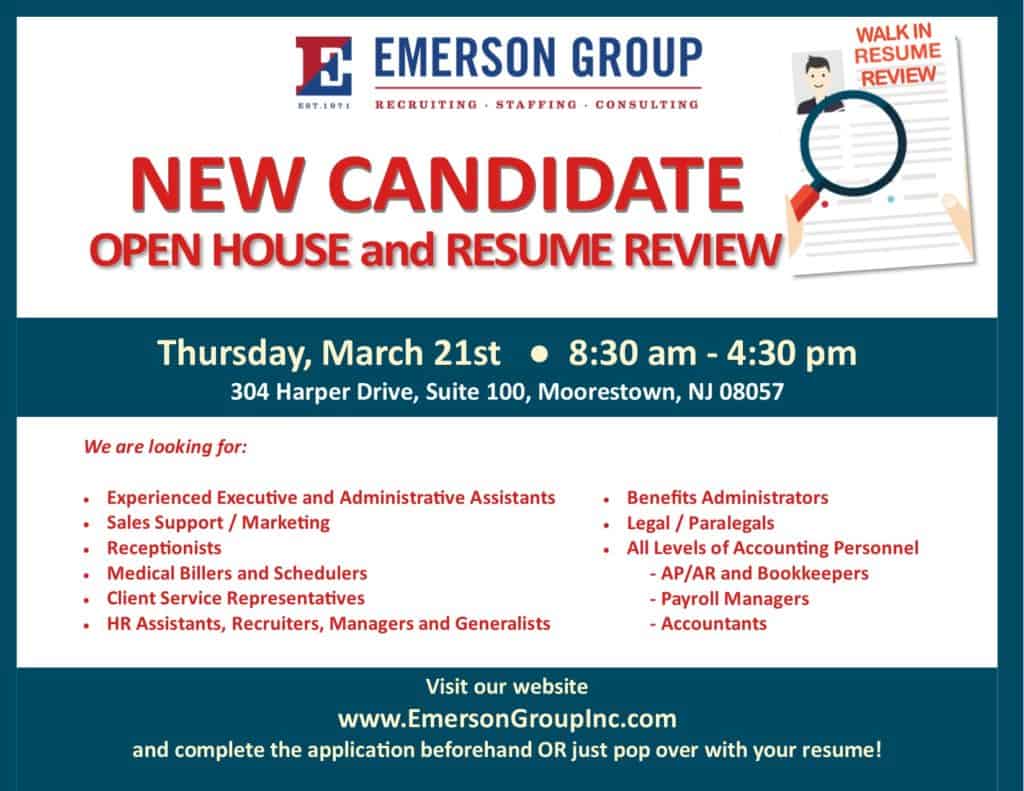 Emerson Group’s NEW Candidate Open House and Resume Review – Thursday, March 21 from 8:30 am – 4:30 pm