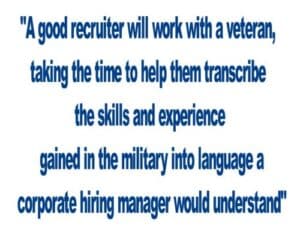 A good recruiter will work with a veteran, taking the time to help them transcribe the skills and experience gained in the military into language a corporate hiring manager would understand. This doesn’t mean fabricating anything, of course, but merely explaining how leading a platoon or overseeing the logistics of a multi-million dollar supply chain can be transferred to the role for which they are applying.