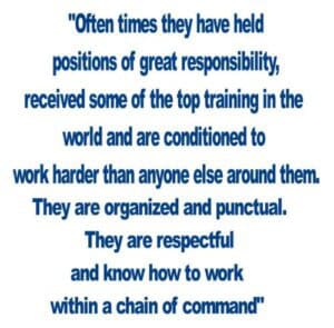 Transitioning military veterans are a unique sub-group of job seekers. Often times they have held positions of great responsibility, received some of the top training in the world, and are conditioned to work harder than anyone else around them. They are organized and punctual. They are respectful and know how to work within a chain of command. Turned off by job hopping? They have dedicated anywhere from 4 to 20 years with the same organization.