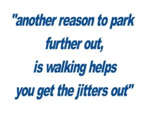 - Another reason to park further out is walking helps you get the jitters out! Researchers led by Mark Krasnow, a professor of biochemistry at Stanford University, describe why deep breathing, including the breath-focus of meditation, can induce calm and tranquility. Breath in and out strong once you get out of the car and then normal breath